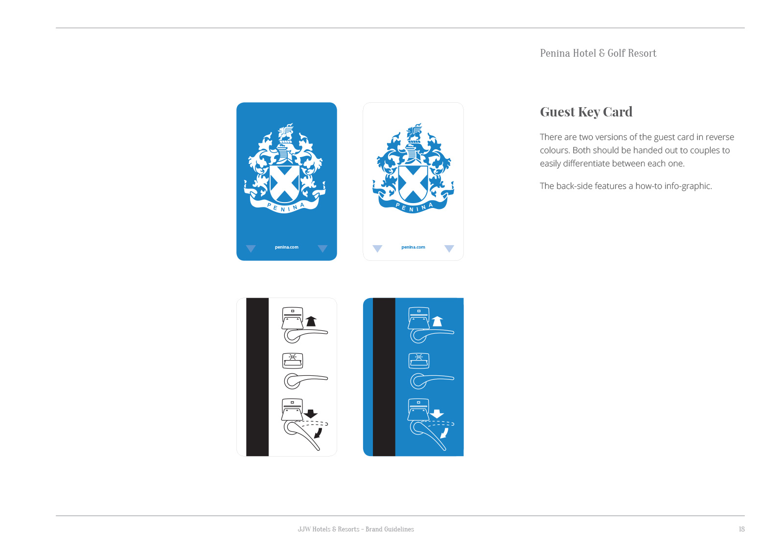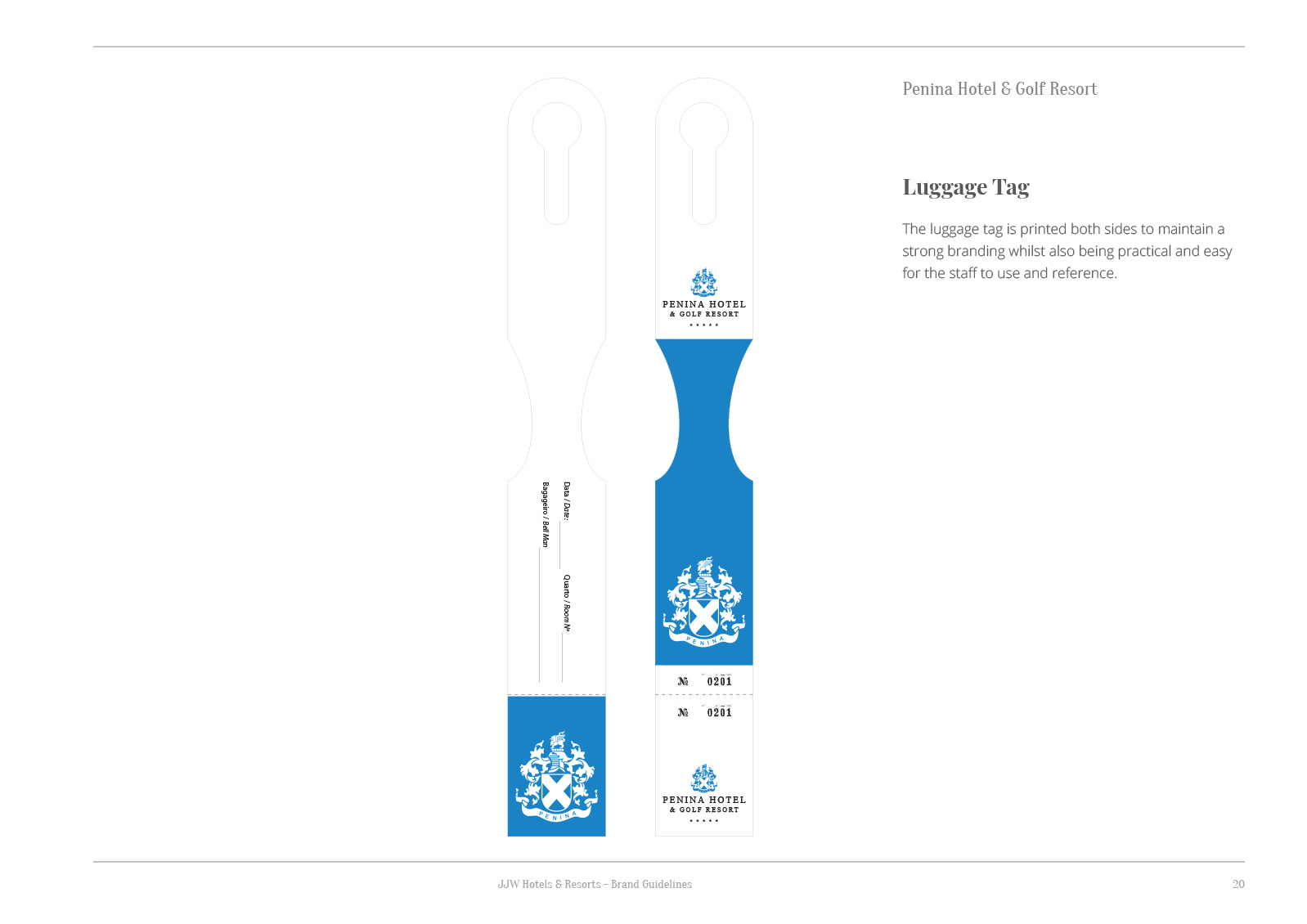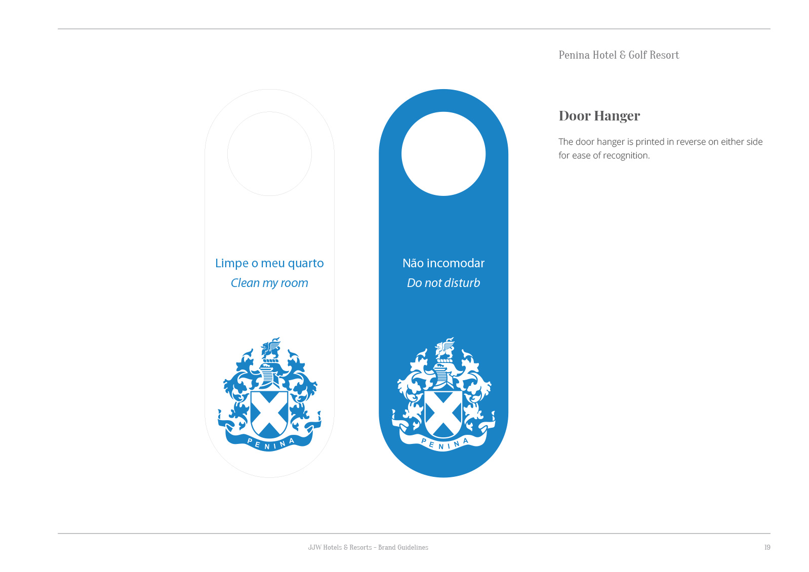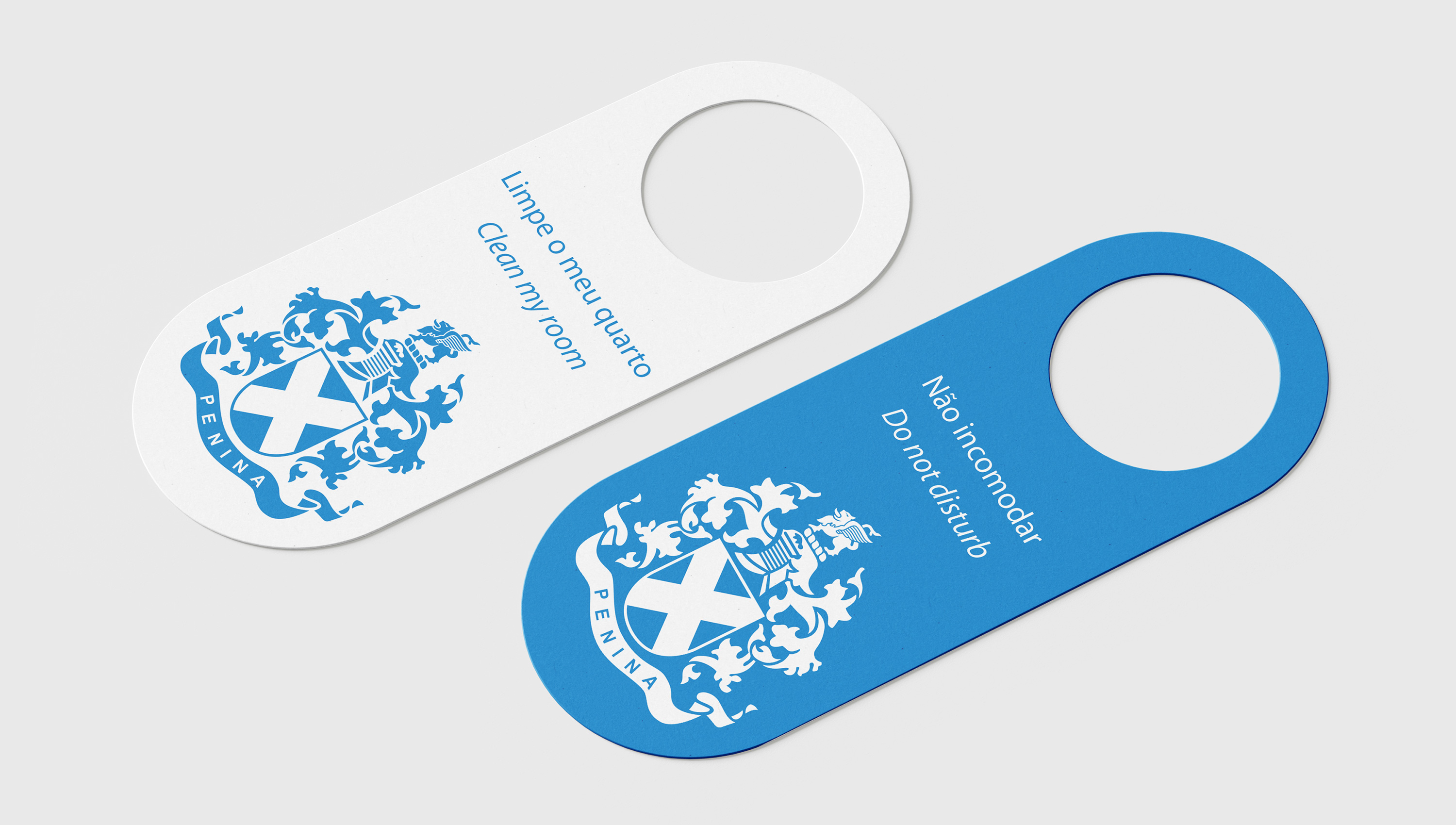The brand is neatly applied to door hangers for guests and housekeeping staff to quickly understand the meaning of each side.